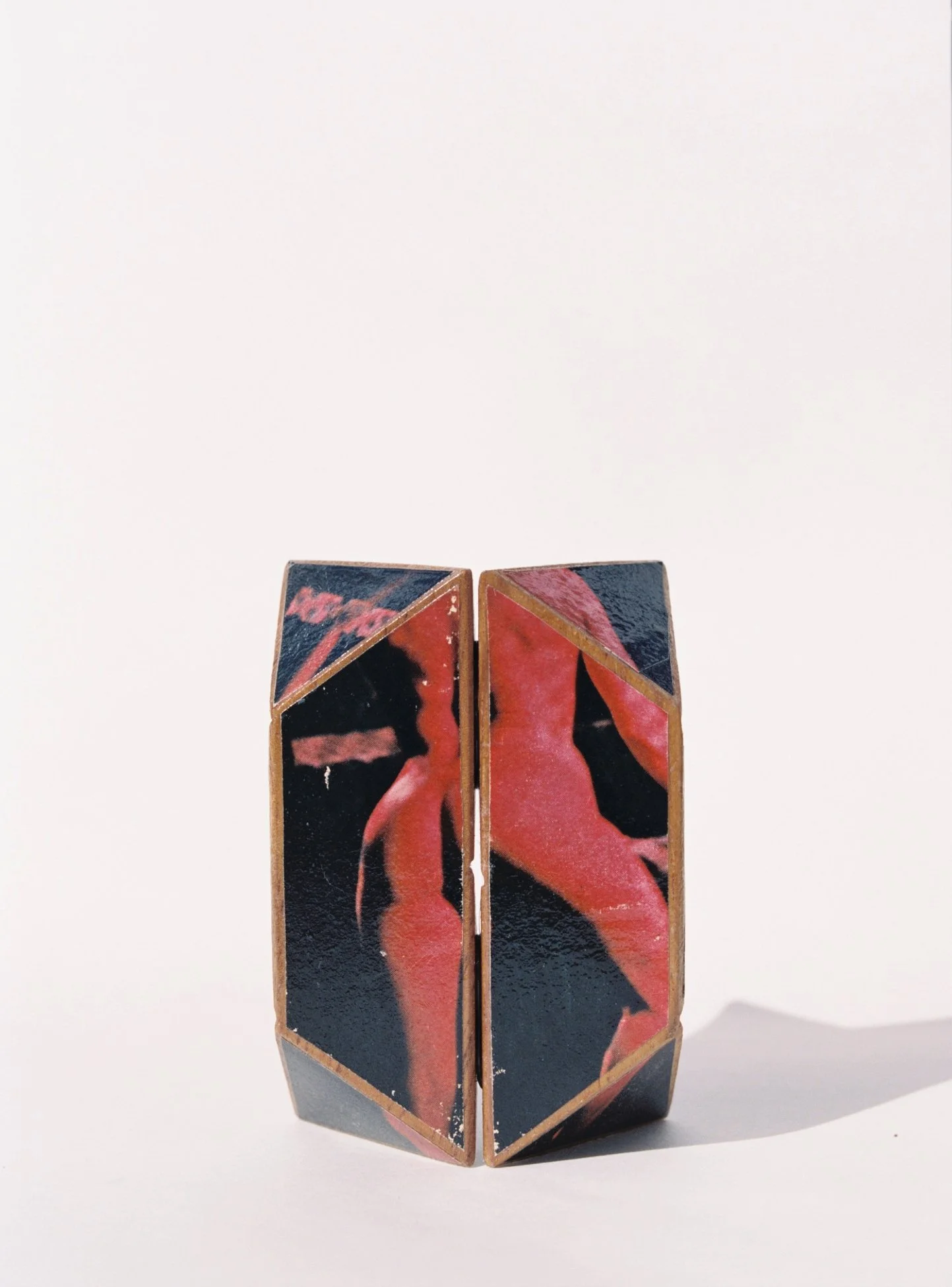 double-sided figure no.5 repurposed playboy on teak wood blocks (3 x 1 x 1 1/4”)